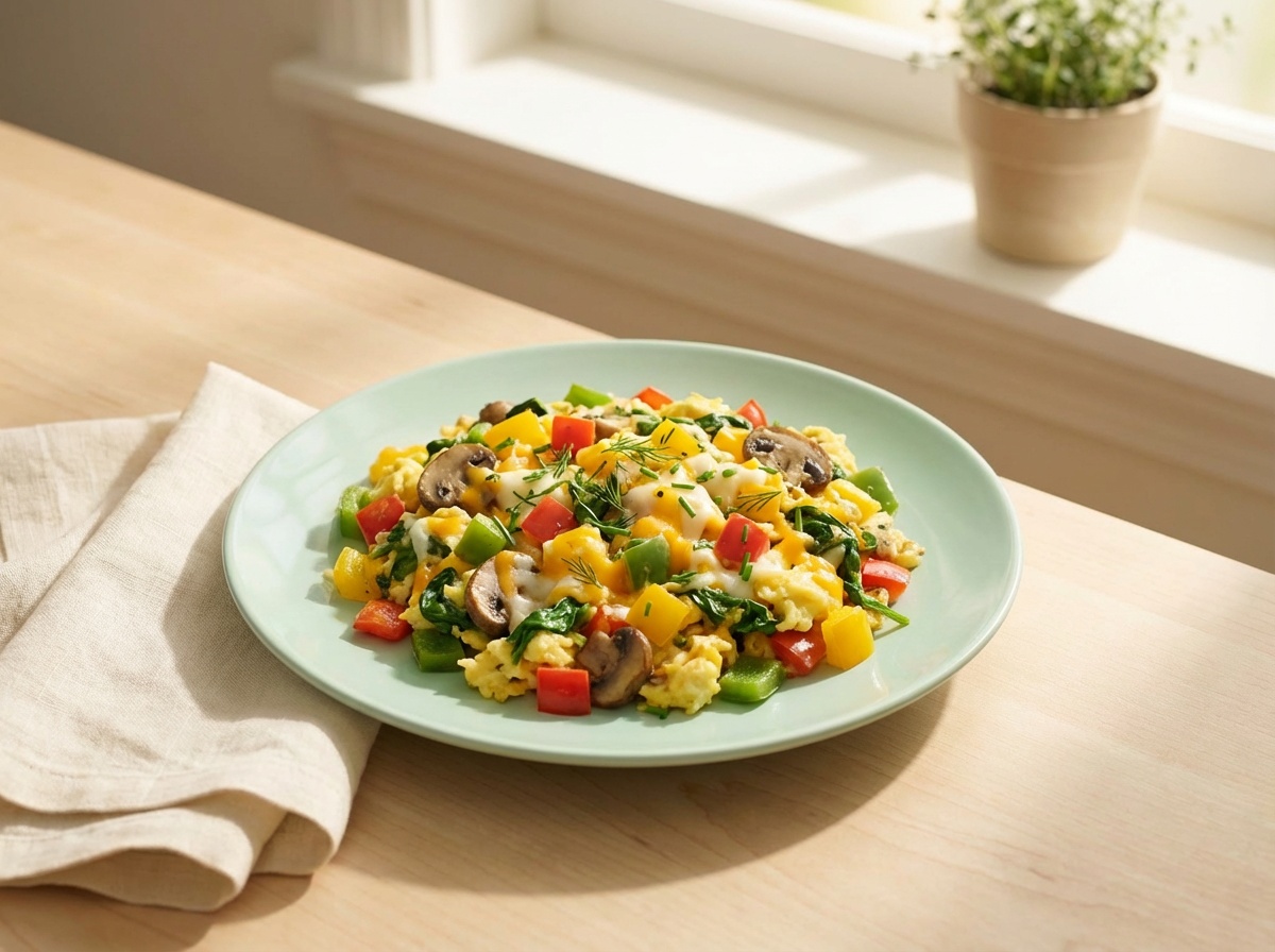 Scrambled eggs with sauteed bell peppers, mushrooms, spinach, melted cheddar