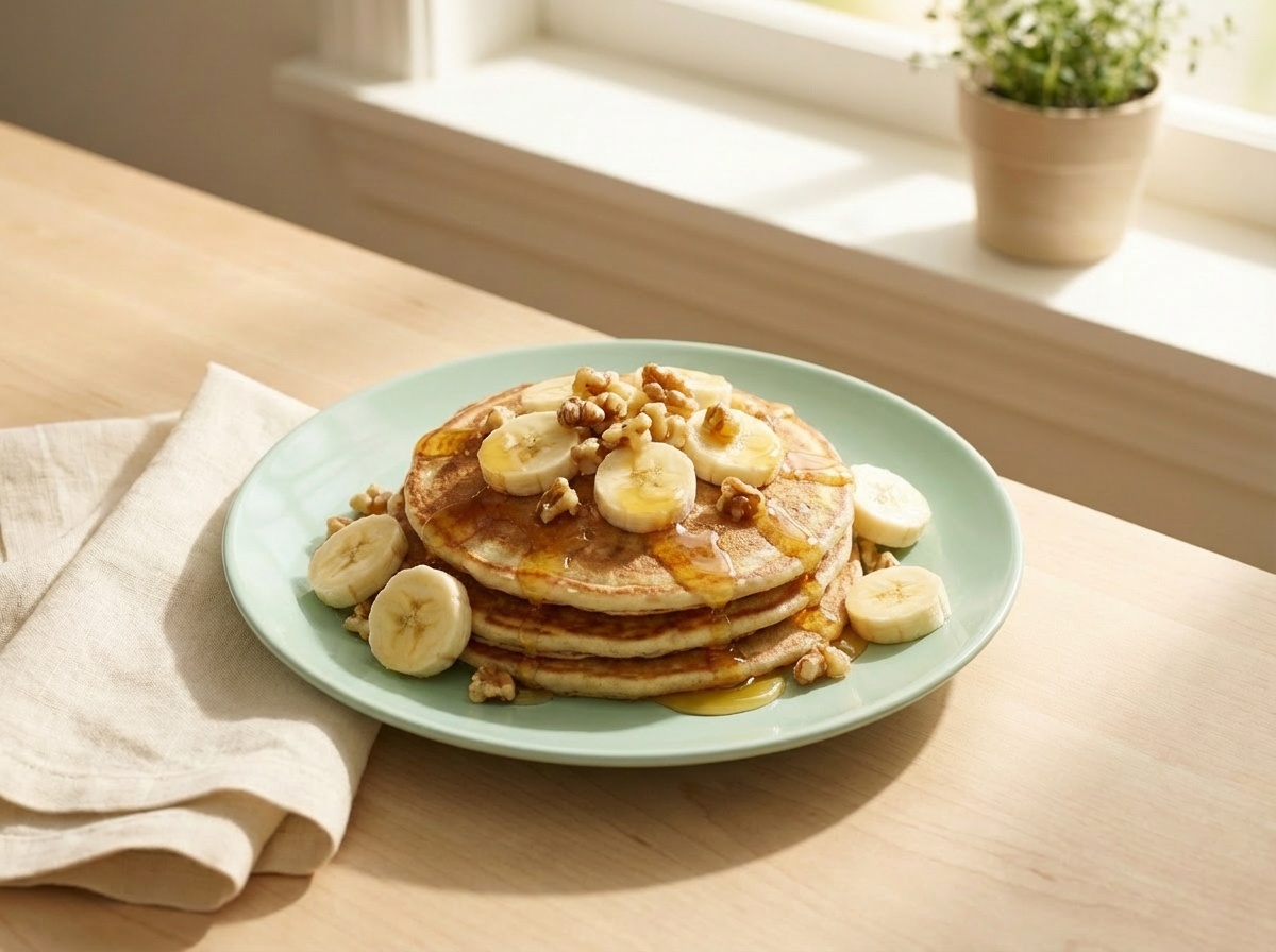 Buttermilk pancakes with caramelized bananas, toasted walnuts, warm honey drizzle