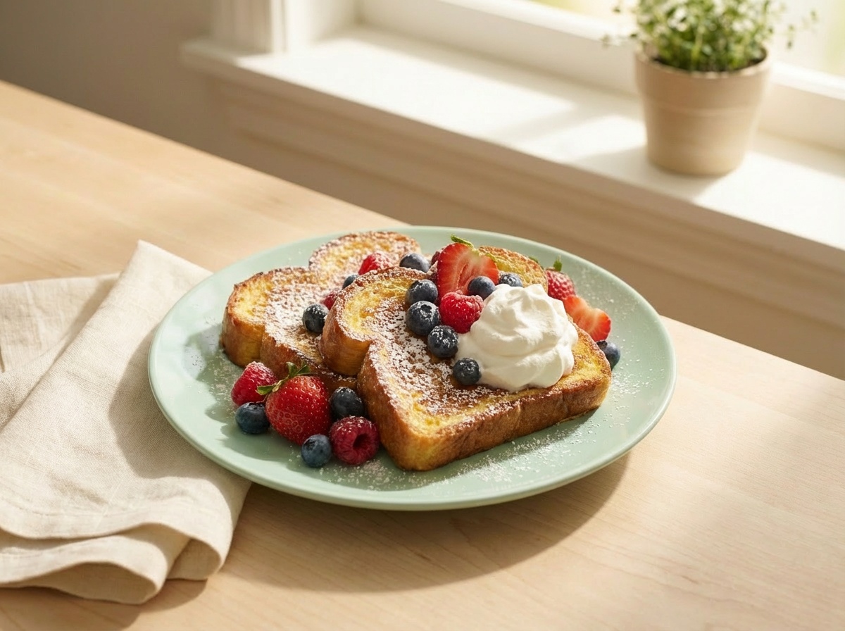 Thick-cut brioche, vanilla custard batter, powdered sugar, mixed berries, whipped cream