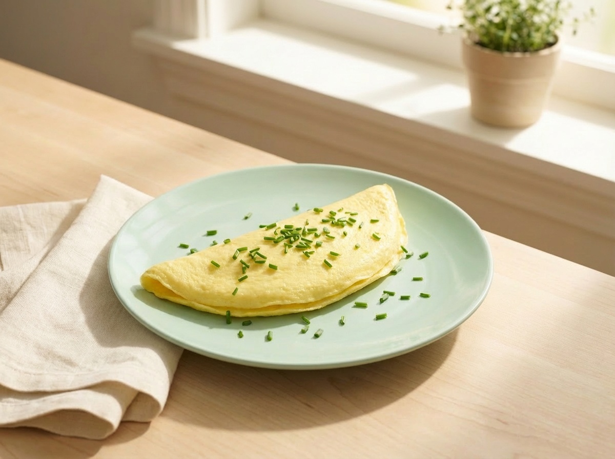 Perfectly folded butter omelette with fresh chives, served with mixed greens