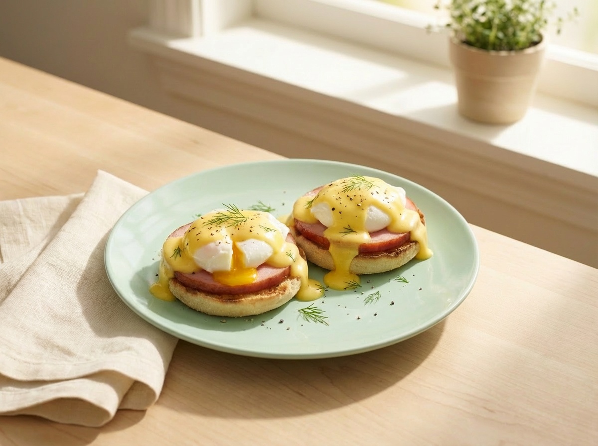 Poached eggs, Canadian bacon, house hollandaise on toasted English muffins