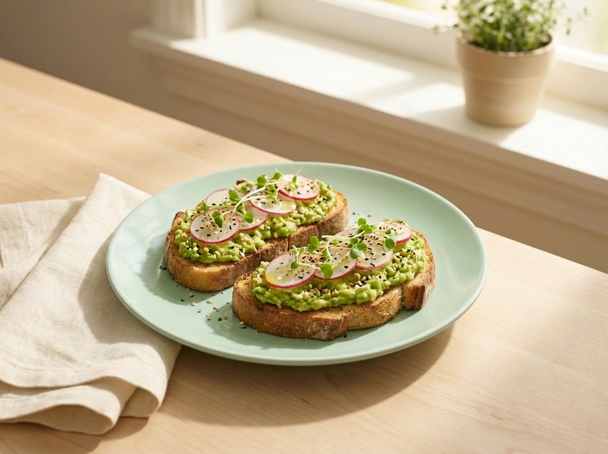 Sourdough, smashed avocado, sliced radish, everything seasoning, microgreens, lemon