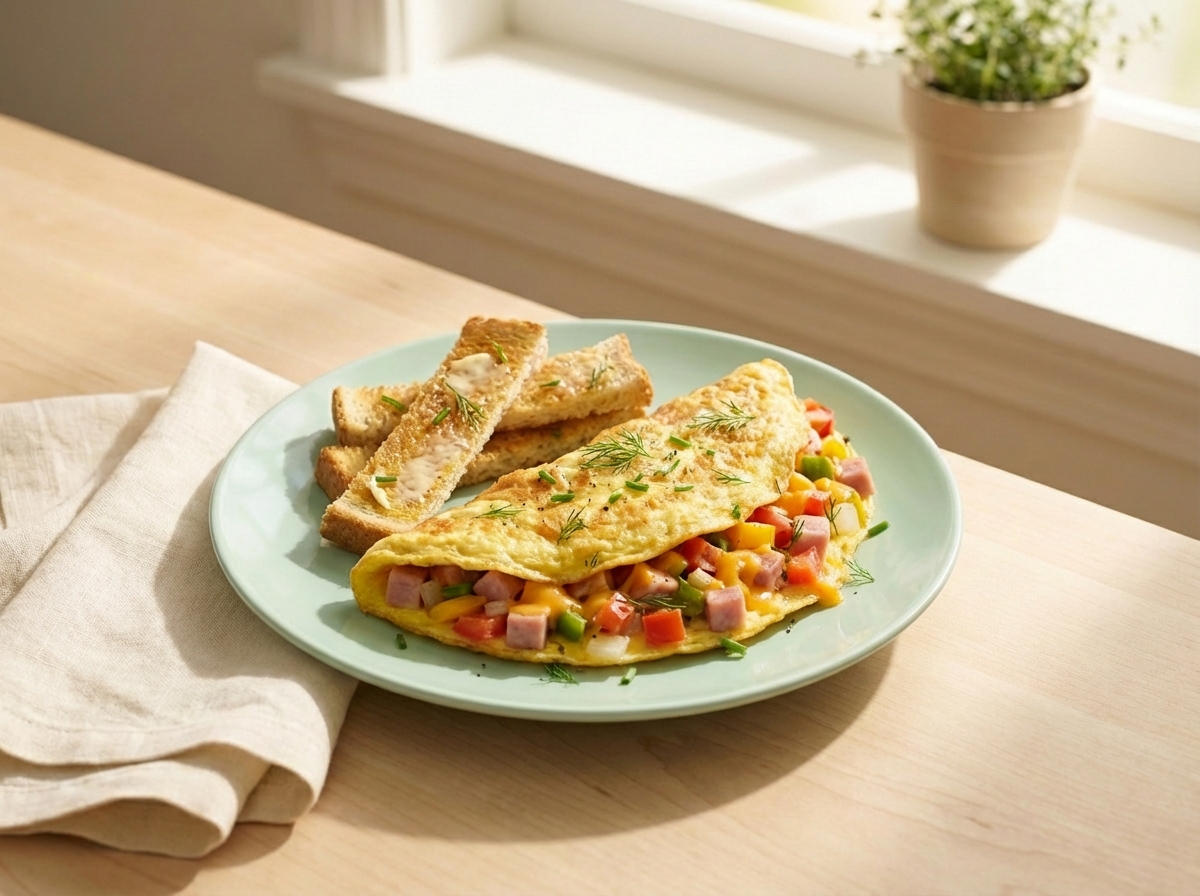 Loaded with ham, roasted peppers, caramelized onions, tomatoes, cheddar