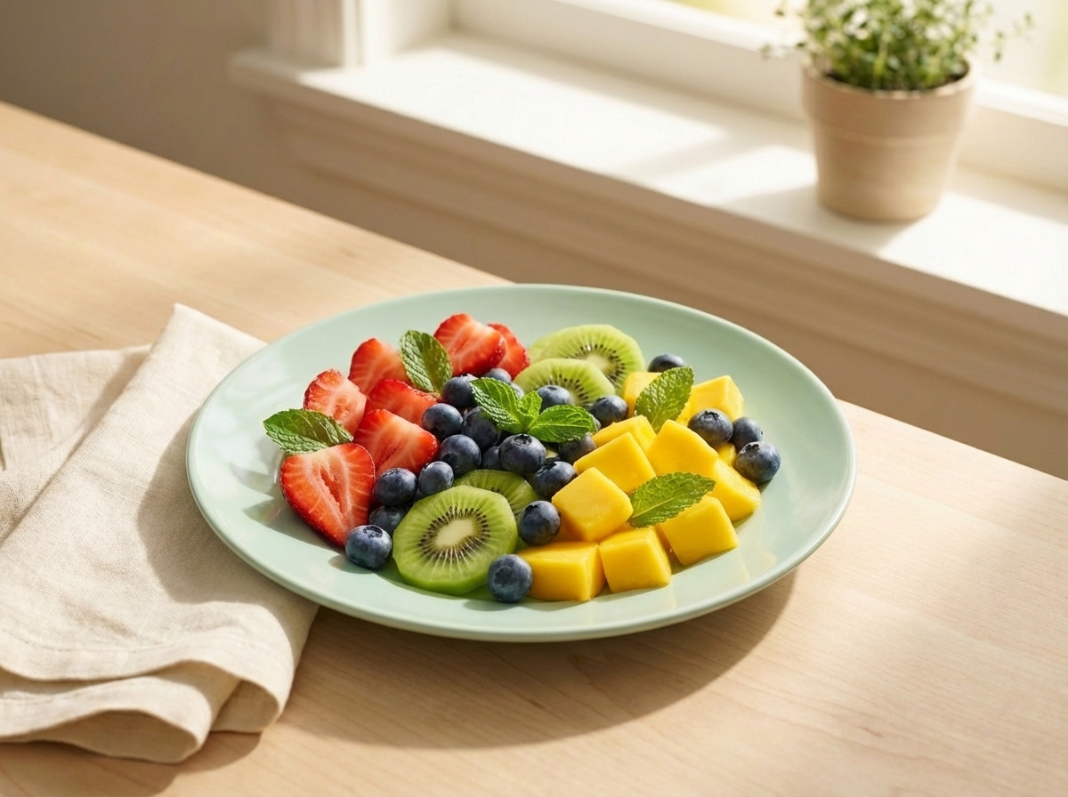 Seasonal sliced strawberries, blueberries, kiwi, mango, fresh mint